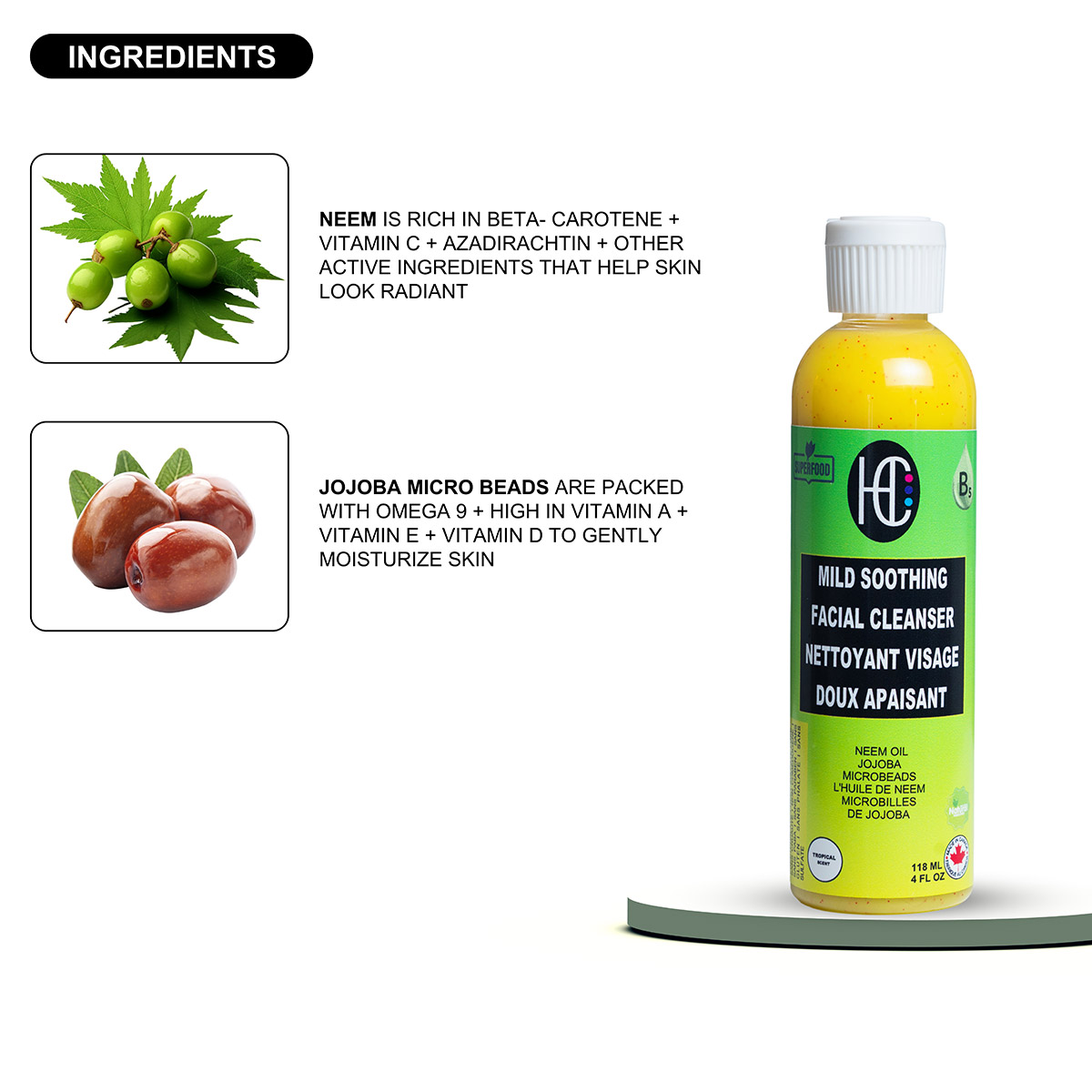 Mild Soothing Facial Cleanser – Daily Hydrating Face Wash with Neem Oil & Jojoba Microbeads | Vitamin B5 & Avocado Oil | 118mL / 4 fl oz